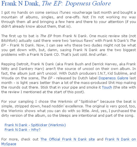 source: http://onehundredb.com/2007/06/21/frank-n-dank-the-ep-dopeness-galore/ Style: Hip Hop Artist: Frank N Dank